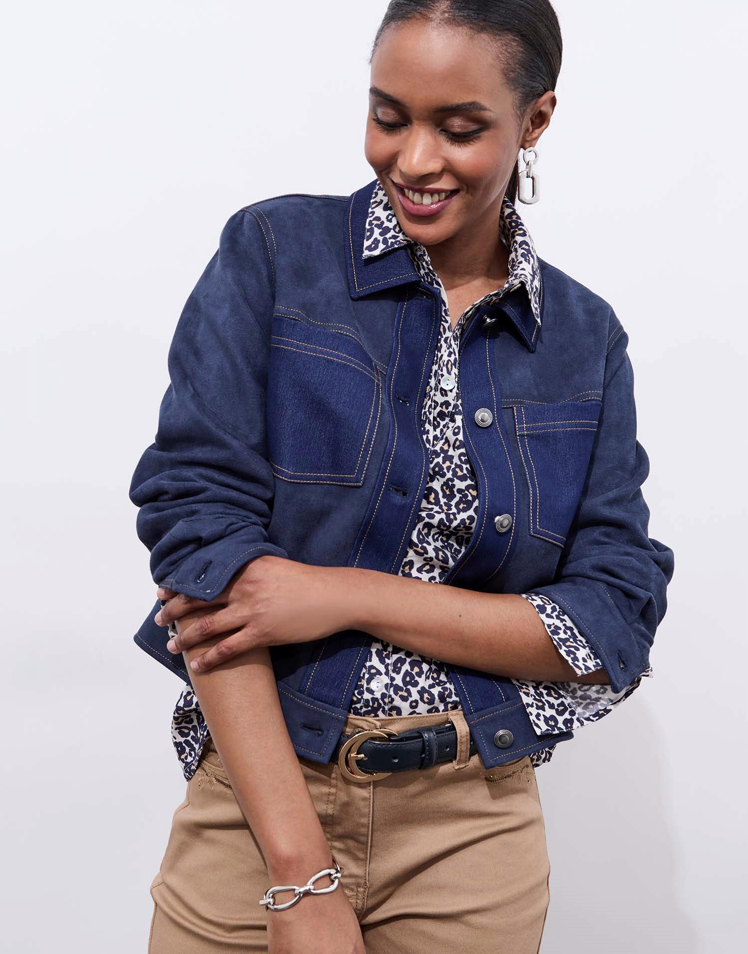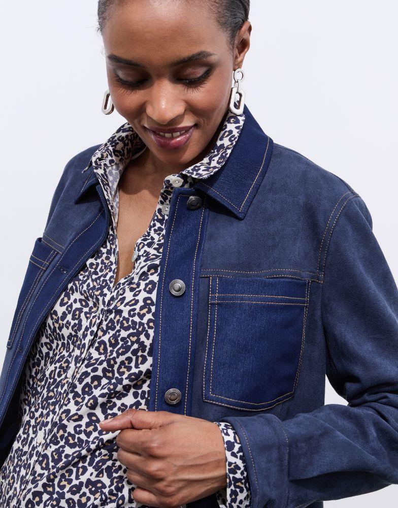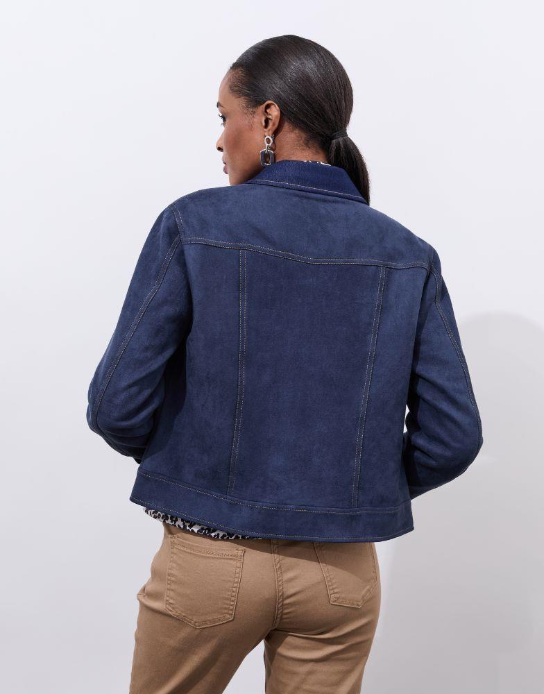 Détails produit : Blouson courte en suédine uni décoré, Col simple, boutonnage sur le devant, manches longues, poches poitrine et détail bi matière. Couleur : MARINE
