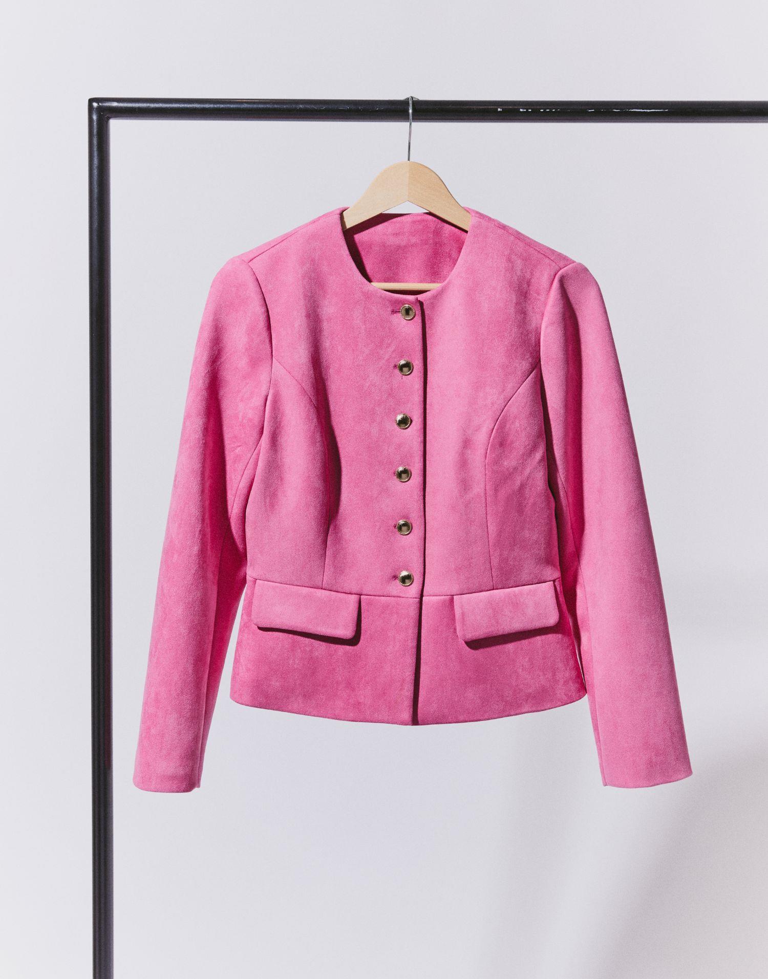 Détails produit : Veste unie, sans col et boutonnage sur le devant. Couleur : ROSE