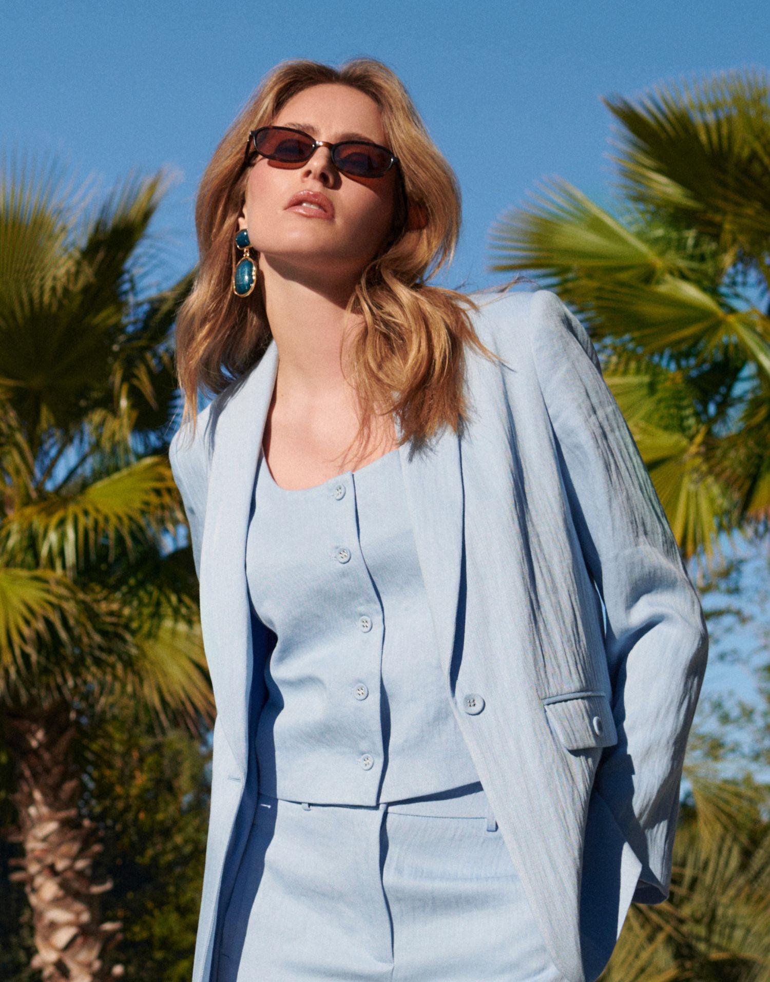 Détails produit : Gilet court uni, sans col. Couleur : BLEU CIEL